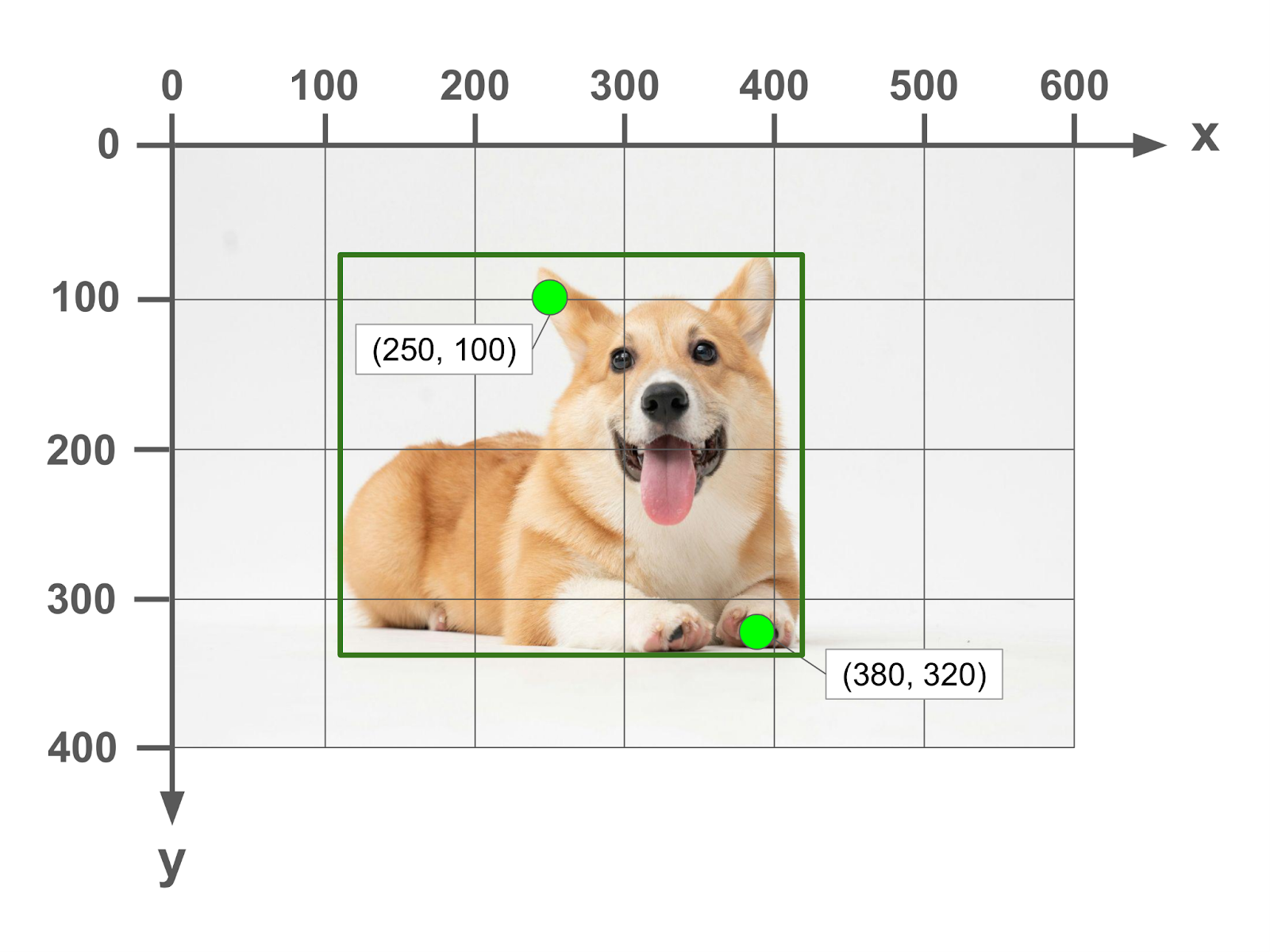 In order to describe the bounding box, the image is laid onto an x-y coordinate grid. The x-axis runs horizontally left to right, with the 0 point at the left of the image. The y-axis runs vertically up to down, with the 0 point at the top of the image.